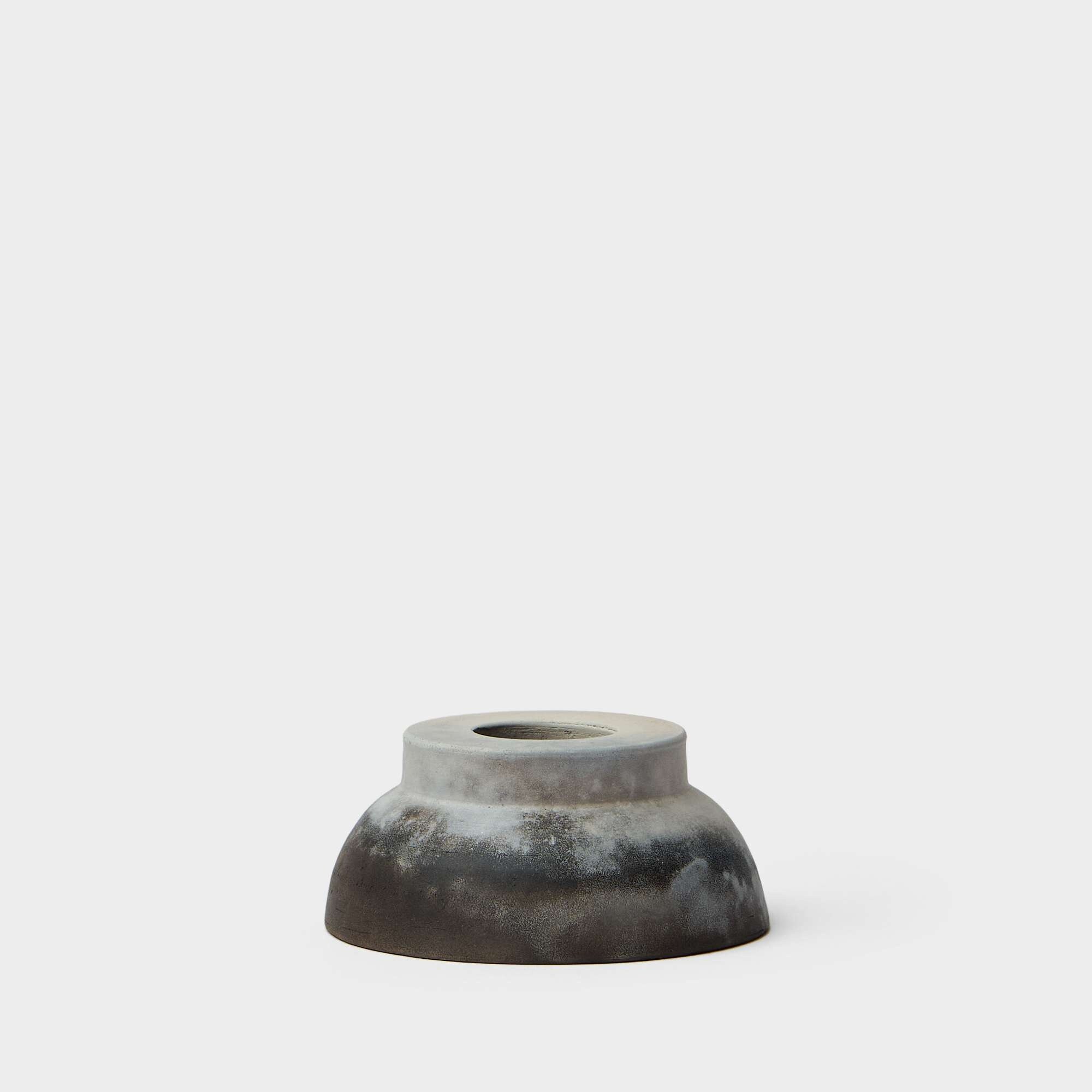 The candle holder is unglazed with a silky matte surface where fire and smoke have left unique marks, making every piece one of a kind.
