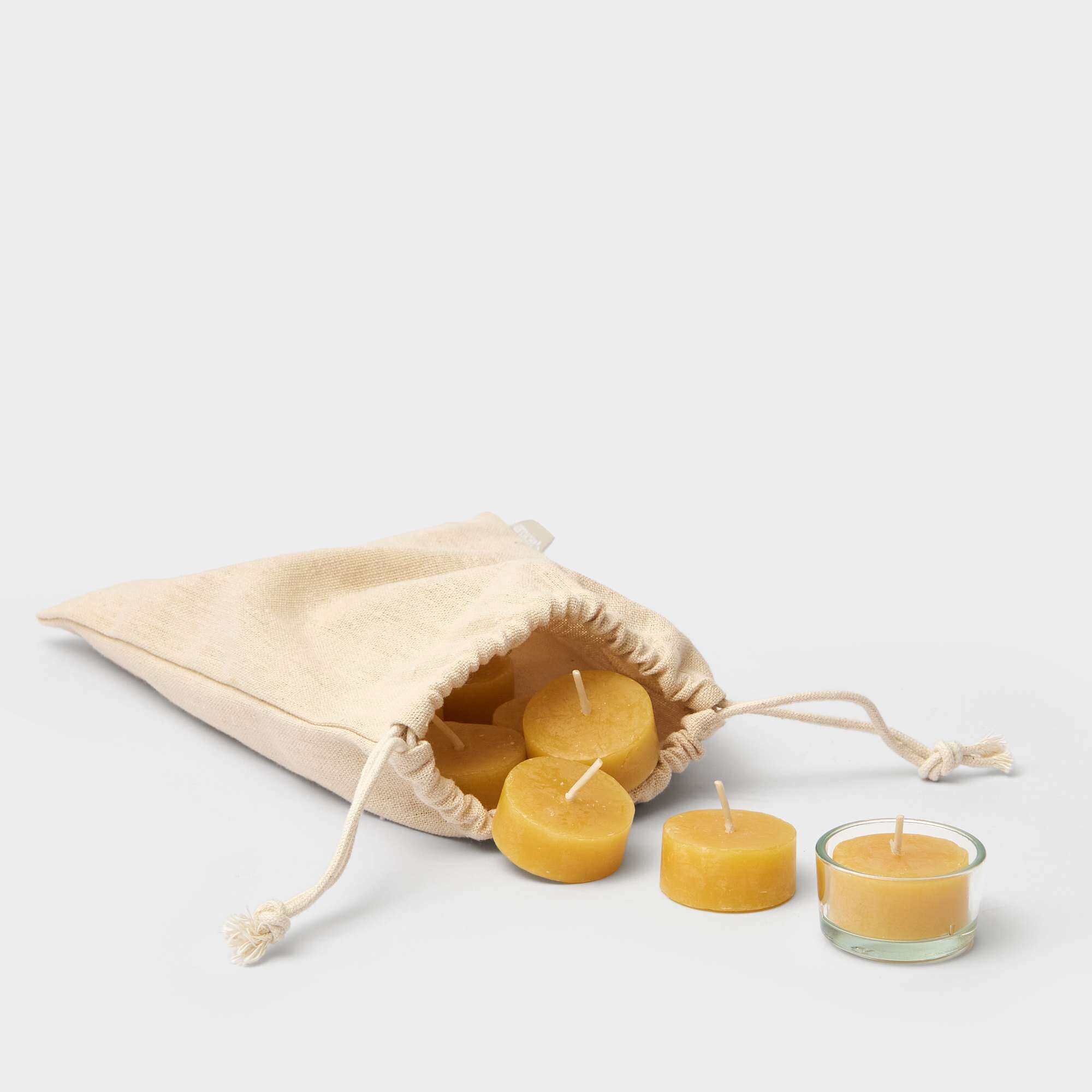Hand-dipped tealights made from 100 % Swedish beeswax in reusable glass cups. Beeswax candles burn with a warm glow and may help purify indoor air from dust, allergens, and particles. A white bloom may sometimes appear on the surface when natural beeswax reacts with oxygen. This is a natural sign that the candles are made from pure beeswax. Beeswax is a renewable natural material and biodegradable.