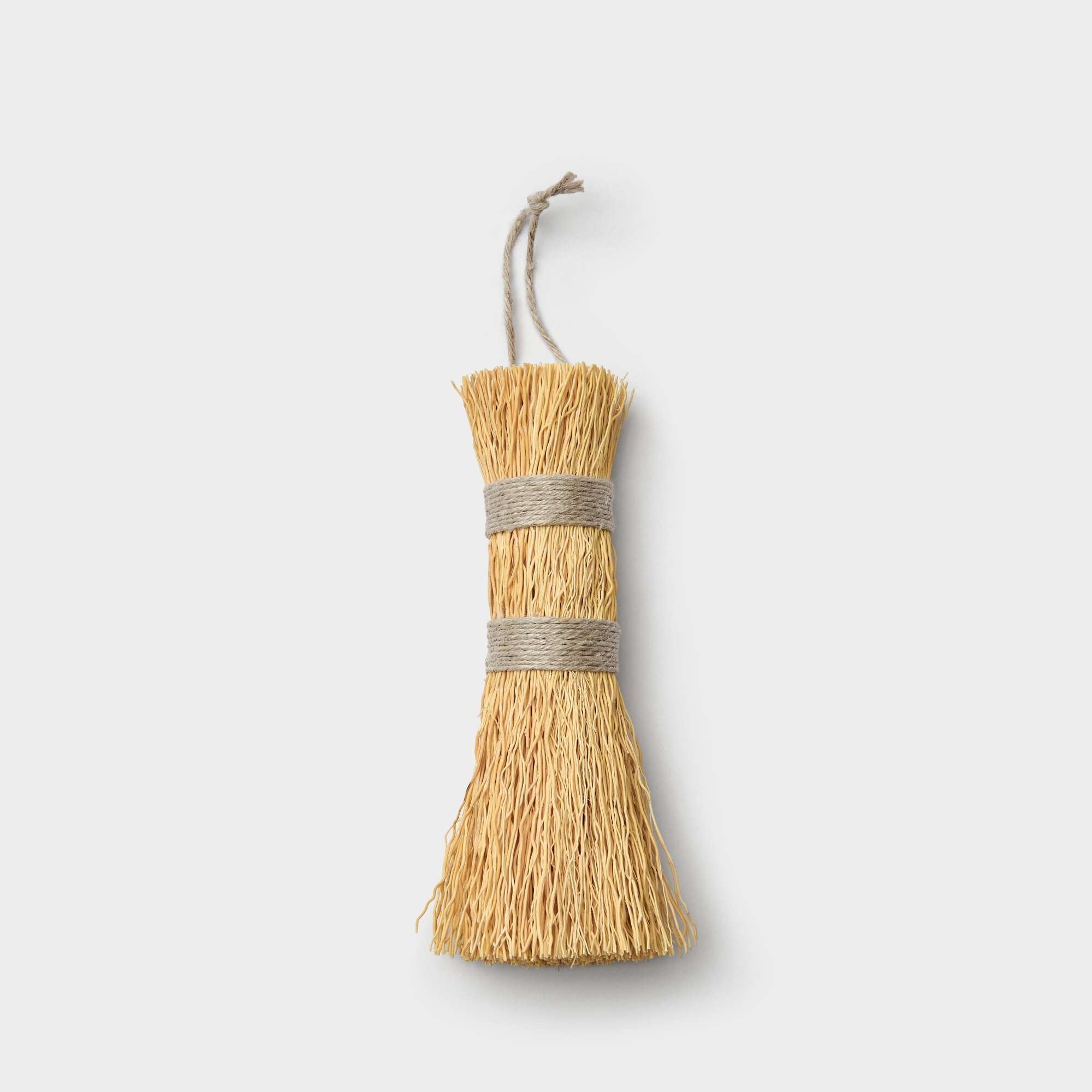 Dish scrubbing brush made from rice root, a natural material traditionally used for heavier cleaning in the kitchen. The double bindings make the brush extra sturdy and provide a firm grip during washing up. Placing the brush in boiling water for a few minutes before use softens the fibres and gives them added flexibility and resilience. This makes it particularly suitable for scrubbing frying pans, pots and other cookware that require a more thorough clean.